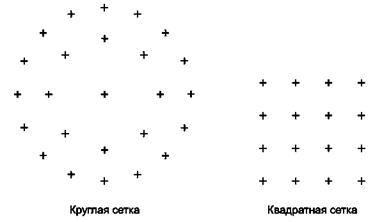 Измерительная сетка состоит из определенного числа равномерно расположенных точек, образованных пересечениями очень тонких линий. На рисунке 1 показаны в качестве примеров два типа сеток (круглая и квадратная), которые могут быть использованы.
