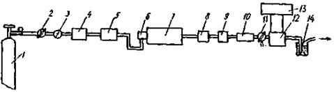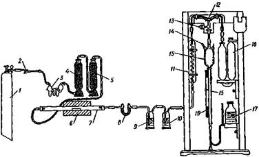 1 - баллон кислородный с редуктором; 2 - кран для регулирования тока кислорода; 3 - калиаппарат с раствором кали едкого для очистки кислорода; 4 - колонка с аскаритом или известью натронной для очистки кислорода; 5 - колонка с кальцием хлористым безводным для сушки кислорода; 6 - печь для сжигания образцов; 7 - трубка фарфоровая или кварцевая; 8 - U-образная стеклянная трубка с ватой асбестовой для удержания механических примесей; 9 - сосуд поглотительный с раствором ангидрида хромового в кислоте серной для удержания окислов серы; 10 - сосуд поглотительный с раствором калия двухромовокислого в кислоте серной для удержания окислов азота; 11 - холодильник для охлаждения газов; 12 - кран трехходовой; 13 - кран для соединения бюретки газоизмерительной с атмосферой (необходимо сделать вывод от крана 13 за пределы рабочего помещения); 14 - термометр для измерения температуры в бюретке газоизмерительной; 15 - бюретка газоизмерительная; 16 - подвижная шкала бюретки газоизмерительной; 17 - склянка уравнительная с запирающей окрашенной жидкостью; 18 - сосуд с раствором кали едкого для поглощения углекислого газа.