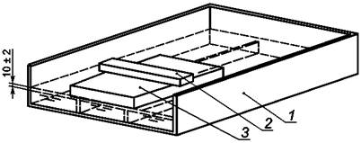 1 - емкость с водой; 2 - пригруз, удерживающий образец в частично погруженном положении; 3 - образец