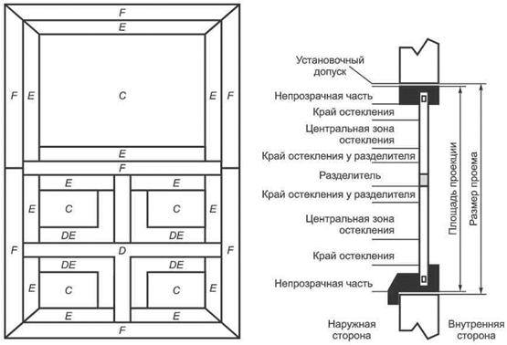 Теплотехнические характеристики всей светопрозрачной конструкции рассчитывают путем объединения свойств всех компонентов системы, используя соответствующие площади проекций этих компонентов либо периметр прозрачной зоны конструкции. Свойства всей конструкции определяют на основе общей площади проекции всей конструкции. Площади проекций компонентов и периметр прозрачной зоны показаны на рисунке 1а.