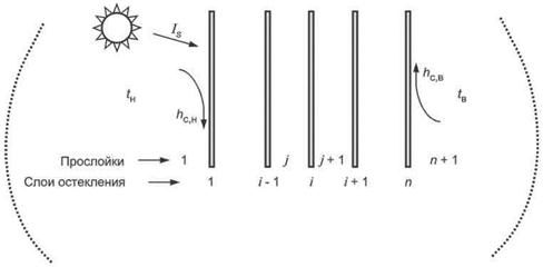 Величина Rц находится суммированием сопротивлений теплопередаче на внутренней и внешней граничных поверхностях термических сопротивлений газовых прослоек и слоев остекления (см. рисунок 2):