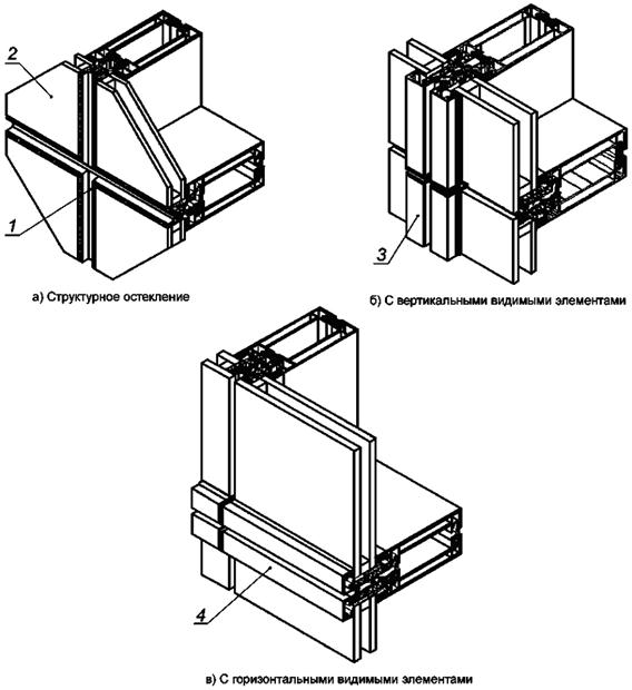 стеклопакет; 3 - вертикальный видимый элемент крепления;