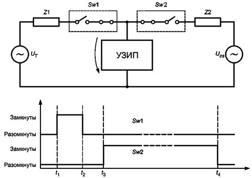 3.4 УЗИП коммутирующего типа (voltage switching type SPD): УЗИП, которое в отсутствие перенапряжений сохраняет высокое полное сопротивление, но может мгновенно изменить его на низкое в ответ на скачок напряжения. Общим примером элементов, служащих коммутирующими устройствами, являются разрядники, газовые трубки, тиристоры (кремниевые выпрямители) и управляемые тиристоры. Такие УЗИП иногда называют «разрядники».