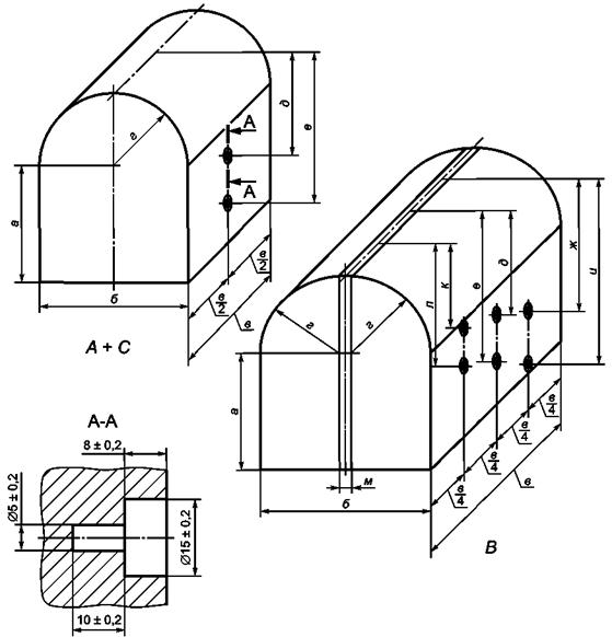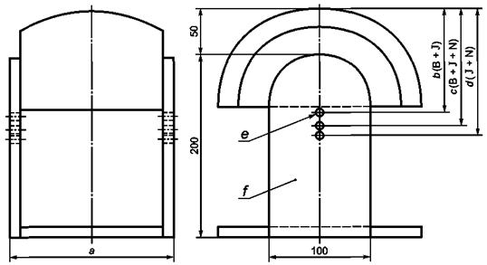 Испытательное приспособление А: а = (100 ± 2,0) мм; б = (125 ± 0,5) мм; в = (100 ± 2,0) мм; г = (62,5 ± 0,5) мм; д = (90 ± 1,0) мм; е = (130 ± 1,0) мм. |