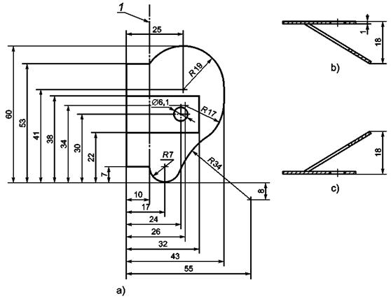 a - формирование макета уха; b - формирование макета левого уха; с - формирование макета правого уха; 1 - линия сгиба