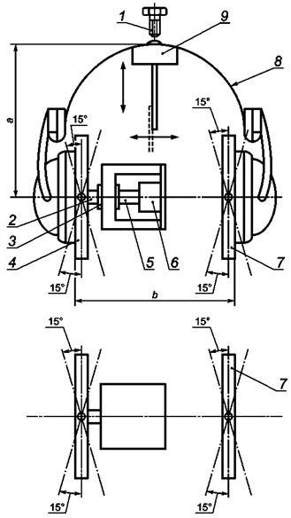 Соответствие вкладышей, соединенных оголовьем, определенным размерам головы испытывают с помощью испытательного приспособления.