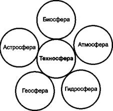 3.1 Техносфера окружена природной средой и взаимодействует с ней. Природная сфера включает в себя астросферу, атмосферу, биосферу, гидросферу и геосферу (см. рисунок 1). Все эти сферы также взаимодействуют друг с другом. Человеческое сообщество рассматривается как часть биосферы.