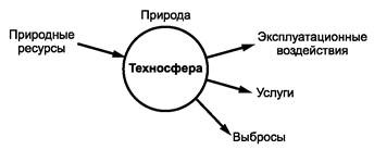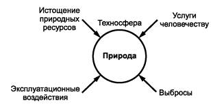 3.4 Операции, посредством которых природные ресурсы вводятся в техносферу, влияют на природную среду двумя способами: через истощение и эксплуатационные воздействия. Наибольший вред техносфера наносит природной среде через услуги, которые предоставляются обществу, и выбросы (см. рисунок 3).