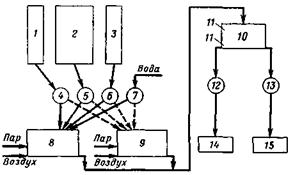 Добавка со склада 1 через дозатор 4 подается 1 в приготовительную емкость 8 или 9. В нее же через дозатор 7 подается необходимое количество воды.