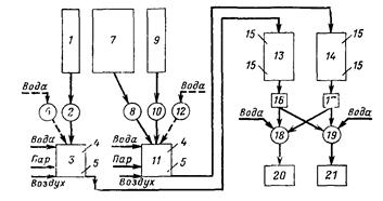 Из расходных емкостей 13 и 14 растворы повышенной концентрации через жидкостные дозаторы добавок 1 16 и 17 подаются в дозаторы воды 18 и 19. В последние вода подается из расчета получения в них растворов рабочей концентрации, которые и поступают затем в бетоносмесители 20 и 21.