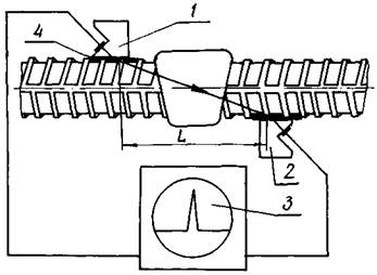 1 - излучатель; 2 - приемник ультразвуковых колебаний; 3 - ультразвуковой дефектоскоп; 4 - контактная смазка