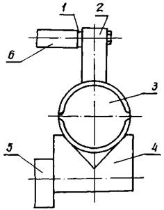 2.2. Для ультразвукового контроля применяют наклонные искатели, рассчитанные на частоту 2,5 МГц, угол 50°*). Контактная поверхность искателя притирается по диаметру стержня путем продольных перемещений его по стержню, обернутому наждачной бумагой. В механическом устройстве (МУВ) искатель крепится через специальное отверстие (рис. 3), обеспечивающее его самоустановку.