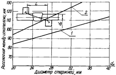 Рис. 4 График выбора расстояния между искателями в зависимости от диаметра стержня для способов сварки ВП-Г, BМ-I, ВО-Б (кривая 1) и ВП-В (кривая 2) по ГОСТ 14098-68