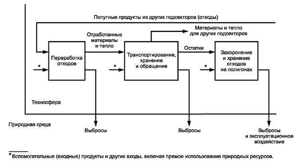 В добавление к главному выходу существуют побочные продукты как от нормальной работы, так и от вывода из эксплуатации самих технических энергетических систем. Некоторые побочные продукты, относящиеся к отходам, являются входами к подсектору погрузки-разгрузки и переработки, который производит регенерируемые ресурсы и выбросы.
