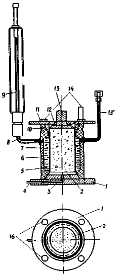 1 - днище; 2 - перфорированный штамп; 3 - канал; 4 - трубка для удаления воды из образца; 5 - корпус; 6 - гидравлическая камера; 7 - рабочая камера; 8 - патрубок, соединяющий аэростатический манометр 9 с гидравлической камерой; 10 - резиновая оболочка; 11 - выступы стенки корпуса камеры; 12 - металлический фланец; 13 - штамп; 14 - стяжные болты; 15 - трубка для заполнения гидравлической камеры водой; 16 - отверстия под стяжные болты