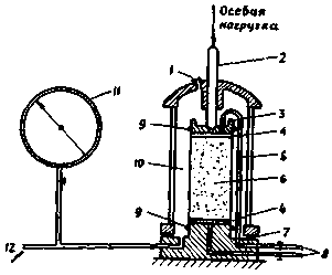 Заключают образец в резиновую оболочку следующим образом. Резиновую оболочку вводят в трубу расширитель и ее концы загибают наружу; воздух, находящийся между оболочкой и трубой, отсасывают резиновой грушей, при этом резиновая оболочка прилегает к внутренним стенкам трубы. Торцы образца покрывают бумажными фильтрами и ставят образец на штамп. На верхнюю плоскость образца кладут верхний штамп. Трубу-расширитель надевают на образец грунта, концы оболочки снимают с трубы, при этом оболочка соскальзывает на образец грунта. Резиновая оболочка на штампах должна быть закреплена резиночными кольцами круглого сечения. Толщина резиновой оболочки должна не превышать 0,15 - 0,20 мм. Для образца диаметром 38 мм при его деформации 10 - 15 % поправка на сопротивление резины составит 0,003 - 0,004 МПа. До установки образца в прибор (см. рис. 12) система трубок, подводящих воду в штампах, и поры в штампах заполняются дистиллированной прокипяченной водой до появления ее на поверхности штампов. В системе не должно быть пузырьков воздуха.