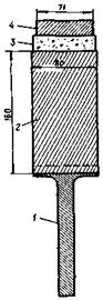 2.4. Для испытания грунтов в компрессионных приборах образец следует вырезать тонкостенным кольцом с острым режущим краем. Рекомендуется образец грунта 3 с помощью штампа 2 с ручкой 1 (рис. 4) выдвинуть из гильзы грунтоноса снизу вверх только на высоту компрессионного кольца 4. После того как образец вырезан, повторить этот прием для вырезывания следующего образца.