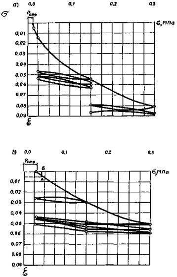 3.5. Опыт в компрессионном приборе должен проводиться в соответствии с требованиями ГОСТ 23908-79 на образцах ненарушенного сложения в подводном состоянии без возможности набухания (под арретиром). Следует применять грунтовую воду или водную вытяжку. В начале опыта необходимо определять давление на грунт, соответствующее сруктуной связности, или давление sэ, эквивалентное природному, если степень влажности Sr грунта меньше 1. Для этого постепенно увеличивают нагрузку на образец ступенями 0,001 МПа до начала деформации грунта (показания мессуры должны превышать тарировочные поправки на деформацию прибора), это давление фиксируется как sстр на графике компрессионной кривой (рис. 6, а). При неполном заполнении пор грунта водой, когда Sr < 1, следует учитывать, что газонасыщенные образцы могут увеличиваться в объеме при подъеме их на поверхность. Величину разуплотнения образца при подъеме его на поверхность рекомендуется определять по формуле В.Г. Булычева (В.Г. Булычев. Теория газонасыщенных грунтов, М., Стройвоенмориздат, 1948):