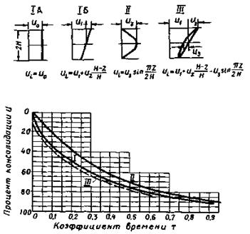 1.5. При проектировании оснований резервуаров определяющим является расчет оснований по деформациям, определение предельно допустимых деформаций при циклическом загружении и прогноз развития осадки основания во времени. При этом достаточно решить одномерную задачу консолидации, которой соответствует компрессионный опыт. Расчеты оснований по прочности имеют подчиненное значение. Их необходимость обусловливается малым заглублением основания по сравнению с диаметром резервуара. Опасность потери устойчивости резервуара возникает, как правило, в период первого наполнения (гидравлические испытания), когда возможно выдавливание слабого слоя грунта. Устойчивость резервуара на сильносжимаемом основании определяют по приближенным формулам, основанным на решениях Прандтля dg = 5,14G, где учитывается только сцепление. Значение dg должно быть больше массы резервуара и воды, заполняющей резервуар.