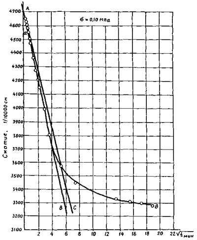 Строят график зависимости относительной деформации от времени при ступенчатом загружении в условиях ползучести (рис. 15). За порог прочности tпр принимают касательное напряжение, соответствующее точке Б на рис. 15.