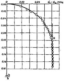 7.26. Для определения касательного напряжения па пределе разрушения (прочность) при трехосном испытании грунта рекомендуется строить диаграмму зависимости относительной деформации от девиатора напряжении s1 - s2*) (рис. 14). Осевое напряжение вычисляют по формуле