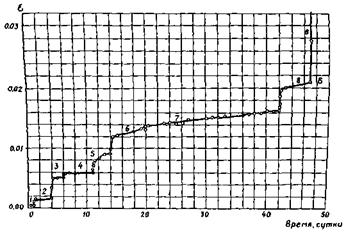 Рис. 15 Зависимость относительной деформации суглинка от времени при ступенчатом загружении: