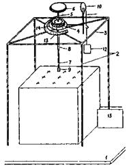 8.3. Для определения прочности при исследовании тиксотропии в лабораторных условиях рекомендуется упрощенный лопастной прибор, показанный на схеме (рис. 16). Прибор смонтирован на плите 1. На плите укреплены четыре металлические трубки 2, жестко соединенные с рамой, на которой в шарикоподшипнике 4 укреплена трубка 5 со шкивом 6 на верхнем конце. В нижнюю часть трубки 5 вставляется шток 7, закрепленный в трубке двумя винтами 8. Нижняя часть штока имеет нарезку, на которую навинчивается рабочий орган в виде крестообразно расположенных прямоугольных лопастей 9. Через шкив 6, блок 10, укрепленный на стойке посредством капронового шнура 11, прикладывается нагрузка, помещаемая на площадку в ведерко 12, создающая крутящий момент. Угол поворота шкива измеряется в градусах по транспортиру 13, неподвижно закрепленному на раме 3 и с помощью стрелки 14.