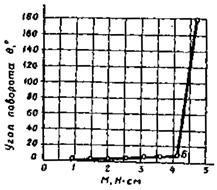 Деформацию грунта рекомендуется фиксировать по транспортиру в градусах после каждой ступени нагрузки. За критерий разрушения следует принимать точку Б на кривой зависимости угла поворота стрелки прибора от крутящего момента (рис. 17). Крутящий момент, Н × см, высчитывают по уравнению: