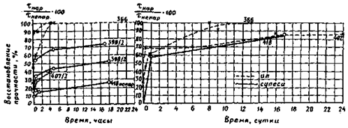 Рис. 18. Восстановление структурной прочности грунта во времени после нарушения структуры перемешиванием грунта и вибрацией