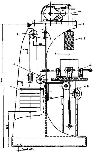 1 - электродвигатель; 2 - станина; 3 - двухперовое сверло для выбуривания центральной части образца; 4 - многозубая полая фреза; 5 - тиски для закрепления монолитов; 6 - механизм подъема стола; 7 - платформа для уравновешивающих стол, грузов; 8, 9 - системы блоков (А.С. № 387242, 1973, Б.И. № 27)