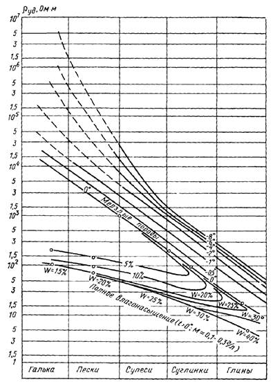 1.5. Зависимость УЭС мерзлых рыхлых пород (гальки, песков, супесей, суглинков, глин) с массивной криогенной текстурой от их температуры изображена на рис. 1. Там же представлена зависимость УЭС талых рыхлых пород от их состава и влажности при нормальной минерализации воды (M = 0,1 - 0,3 г/л) и положительной температуре.