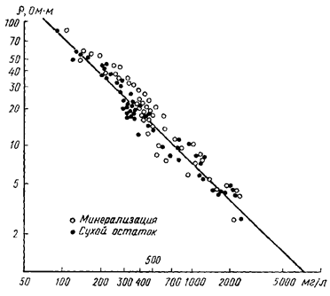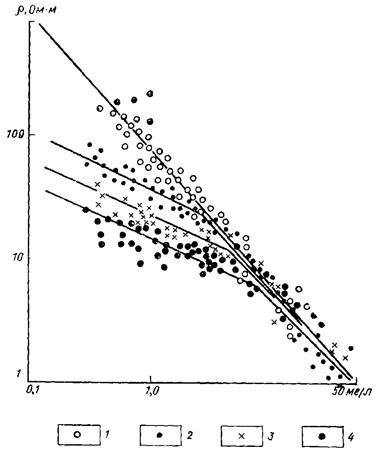1.9. На рис. 3 изображены зависимости удельного сопротивления водонасыщенных рыхлых пород от общей минерализации грунтовых вод. Они построены по результатам интерпретации кривых вертикальных электрических зондирований (ВЭЗ), выполненных вблизи скважин и шурфов.