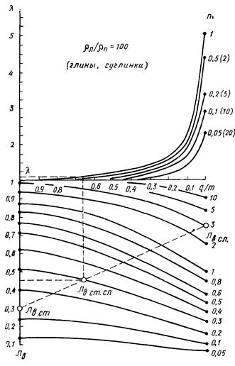 1.13. Льдистость и коэффициент анизотропии мерзлых глин и суглинков с сетчато-слоистой криогенной текстурой могут быть учтены с помощью номограммы, связывающей значения Лв и λ с соотношением q/m и m при μ2 ≈ 100 (рис. 9). Для этого необходимо в нижней части номограммы, описывающей зависимость Лв от q/m и m, отложить величины Лв сл и Лв ст, полученные в предположении горизонтально-слоистой (q/m = 0) или равномерно-сетчатой (q/m = 1) криогенной текстуры. Соединив эти два значения Лв прямой линией, находим точку пересечения ее с кривой, соответствующей заданному значению m. Координаты этой точки будут равны Лв.ст.сл и q/m, в соответствии с которыми может быть найден коэффициент анизотропии по кривым во второй части номограммы. Во всех случаях задача решается однозначно, если известны ρm или ρt, состав, температура, тип криогенной текстуры и соотношение m или состав, ρm и ρt мерзлой породы. Точность решений не выходит за пределы ±0,1 при оценке льдистости и коэффициента анизотропии.