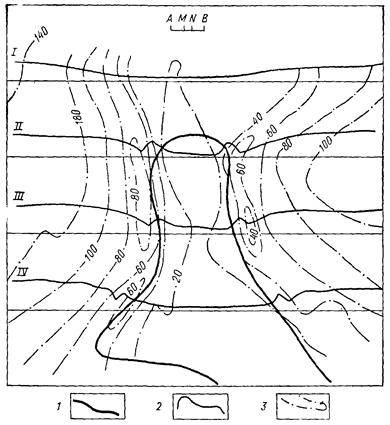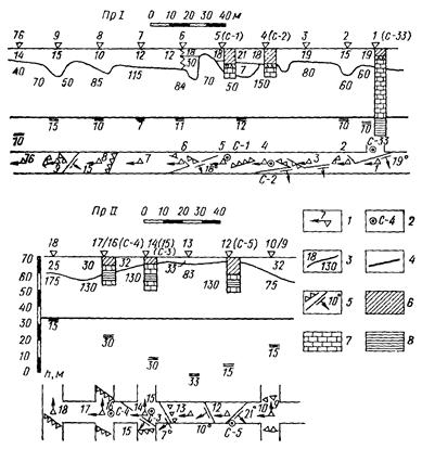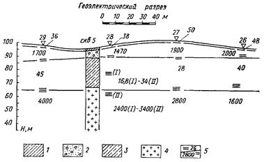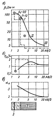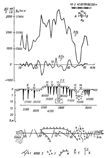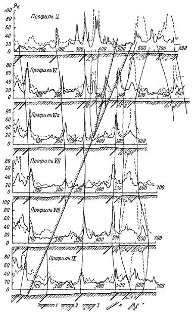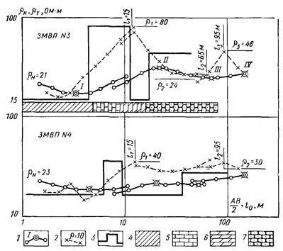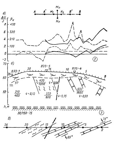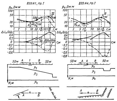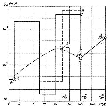 Анализ кривых ВЭЗ (рис. 58) позволяет установить трехслойное строение среды, осложненное ступенью в районе ВЭЗ № 4 и 5. Поэтому количественной интерпретации подвергались кривые, «реставрированные» на основании известных закономерностей изменения кривых ρK вблизи ступени (см. рис. 58). Интерпретация велась методом особых точек с определением «видимой» амплитуды смещения ступени. В результате интерпретации получили: