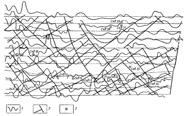 Седьмой слой с УЭС = 20 Ом⋅м может быть отнесен к талым глинам. В зависимости от принятых вариантов состава, льдистости и типа криогенной текстуры мощность мерзлой толщи на данной точке ВЭЗ может изменяться от 150 до 225 м. Последняя цифра наиболее вероятна, поэтому следует принять варианты, относящиеся к ней. По результатам ЭП МДС и ВЭЗ МДС была составлена корреляционная схема геоэлектрических аномалий по всему участку исследований (см. рис. 54). На ней отчетливо обрисовалась полигональная система жил. Для проверки полученных данных на пк. 54, 77, 78, 90 были пройдены шурфы. Все они вскрыли жилы льда, элементы залегания которых оказались в хорошем соответствии с результатами количественной интерпретации данных электропрофилирования и ВЭЗ (ошибка в оценке простирания ф не превышала ±5°). Глубины залегания жил, установленные с помощью ЭП МДС и ВЭЗ МДС, отвечают глубине выклинивания ледяных жил, характерной для данного района. Буровые скважины, пройденные в последствии, полностью подтвердили геофизические данные.