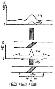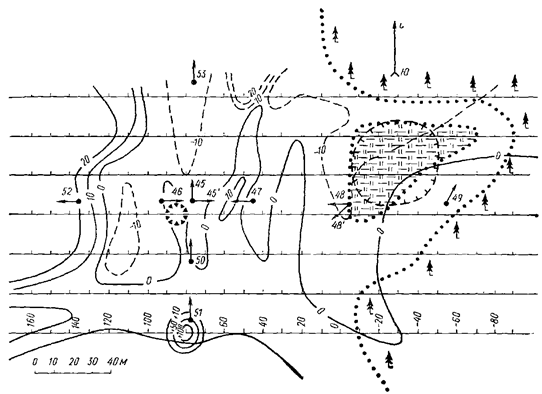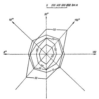 Анализ результатов ЭП показал, что на изучаемой площади преобладают маломощные пласты с повышенным и пониженным УЭС. Они имеют одинаковое простирание, почти совпадающее с направлением профилей, и хорошо прослеживаются от профиля к профилю. Пласты имеют большой угол падения (α = 60 - 90°) по отношению к земной поверхности и залегают на глубине 3 - 5 м (реже 8 - 10 м). На участках неглубокого залегания выделенных слоев обнаружена анизотропия (λK = 1,4 - 1,45) толщи, которая исчезает с увеличением глубины залегания слоев (рис. 55).
