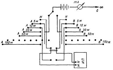 12.20. Измерение интенсивности блуждающих токов производится на двух взаимно перпендикулярных приемных линиях, ориентированных по странам света. В качестве измерительной аппаратуры используют либо шлейфовый осиллограф, либо два милливольтметра переменного тока. Милливольтметры и электроразведочные автокомпенсаторы постоянного тока применяются для изучения длиннопериодных (более 10 - 15 с) блуждающих токов. Наблюдения на одной точке производятся в течение 15 - 20 мин и состоят в одновременном определении величин и знака разности потенциалов на приемных линиях через каждые 10 - 15 с. Определение знака разности потенциалов является условным. Установление его производится по отношению к подземному металлическому сооружению путем измерения разности потенциалов между ним и землей. Необходимо всегда иметь в виду, что измерение интенсивности длиннопериодных блуждающих токов должно производиться только с помощью неполяризующихся электродов.