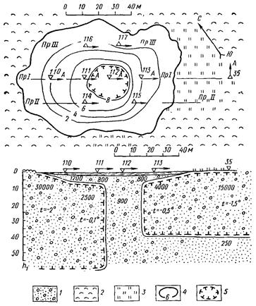 Рис. 59. Результаты съемки ЕП, гравиметрии и симметричных ВЭЗ над пещерой