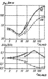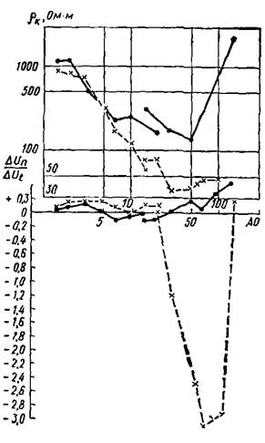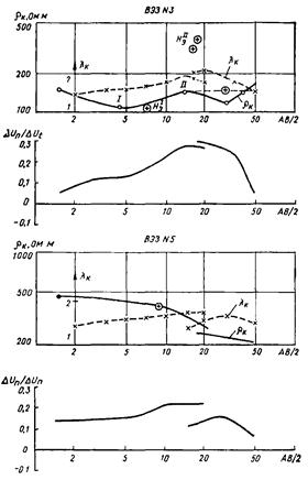 Тщательный анализ кривых ρK и ΔUn/ΔUt позволяет установить, что массив имеет семислойное строение типа AKQQQ. Восходящая ветвь кривой в интервале 5 < AВ/2 < 20 осложнена влиянием близко расположенной жилы льда и вздымается по отношению к оси абсцисс под углом более 45°. Подтверждением тому служит характерная аномалия на кривой ΔUn/ΔUt, указывающая на то, что жила или совокупность их простирается под острым углом к линии профиля. На больших разносах приемных линий искажающее влияние жил ослабевает и кривая ρK может быть проинтерпретирована как горизонтально-слоистая интерпретация ее по особым точкам дает следующие результаты:
