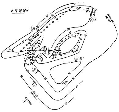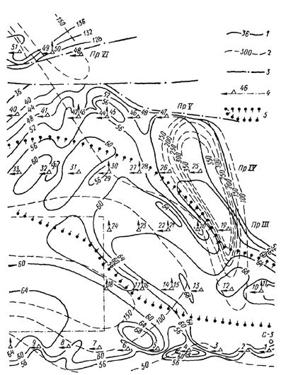 слоев по отношению и склону; 5 - скважины, пробуренные в 1972 г;
