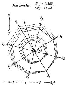 Интерпретация ЭП МДС выполнялась с использованием соответствующих номограмм, по которым определялось простирание, глубина залегания и угол падения крутопадающих геоэлектрических границ.