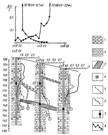 По данным интерпретации построен геоэлектрический разрез (рис. 59), на котором отчетливо выделились рыхлые отложения, трещиноватая зона в кровле карстующихся толщ и монолитные пли слаботрещиноватые гипсы. Граница между трещиноватыми и монолитными гипсами наклонена по отношению к земной поверхности и образует уступ, который хорошо фиксируется по данным интерпретации кривых ВЭЗ. Пещера не выделилась на геоэлектрическом разрезе в силу слабой разрешающей способности последних по отношению к маломощным непроводящим телам. По данным гравиметрии (см. рис. 59) установлено, что пустота приурочена к уступу и залегает в кровле монолитных гипсов или в подошве разрушенных пород.