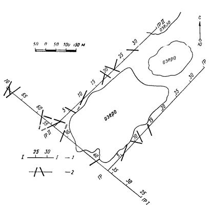 1 - линии профилей и номера пикетов; 2 - повторно-жильные льды