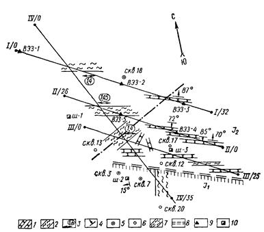 8 - стратиграфическая граница; 9 - точки ВЭЗ; 10 - шурфы