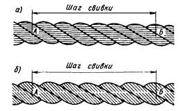 2. Шаг свивки каната определяют следующим образом. На поверхности какой-либо пряди наносят метку (точка А), от которой отсчитывают вдоль центральной оси каната столько прядей, сколько их имеется в сечении каната (например, 6 в шестирядном канате), и на следующей после отсчета пряди (в данном случае на седьмой) наносят вторую метку (точка Б). Расстояние между метками (точками А и Б) принимается за шаг свивки каната. У многопрядных тросов (например, у каната 18´19 = 342 проволоки с одним органическим сердечником) имеется 6 прядей во внутреннем слое и 12 - в наружном. Шаг свивки в этом случае определяется по числу прядей в наружном слое.