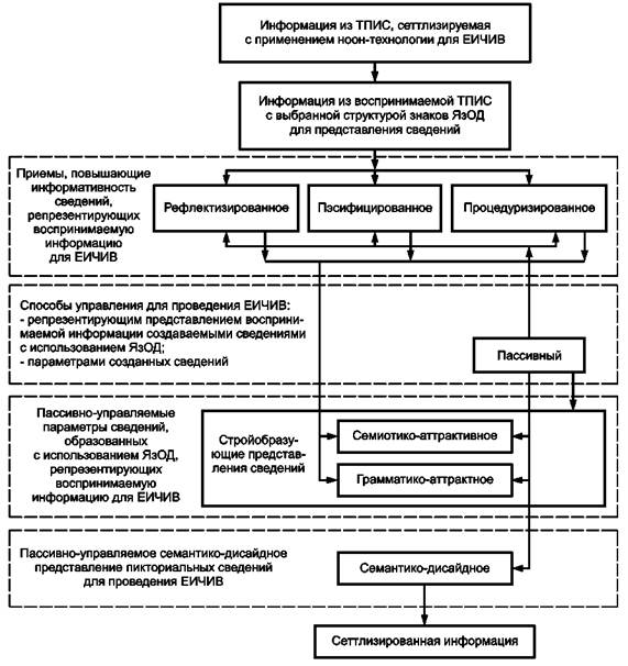 - соответствующим рефлектизированным (обеспечивающим повышение отражательных характеристик сведений), пэсифицированным (обеспечивающим образно-воспринимаемое изложение невидимых сведений), процедуризированным (обеспечивающим управляемость параметров сведений) представлением информации;