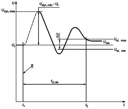 t - время; U - напряжение, В; а - сброс нагрузки; DU - диапазон допустимых отклонений установившегося напряжения, В; Ur - номинальное напряжение на выводах, В; Udyn,min - минимальное переходное напряжение, В; Udyn,max - максимальное переходное напряжение, В; Urec - установившееся показание вольтметра (среднеквадратичное значение напряжения восстановления), В; Usi,mjn - минимально допустимое установившееся напряжение, В; Usi,max - максимально допустимое установившееся напряжение, В; t1 - момент приложения нагрузки; t2 - момент вхождения в заданный диапазон напряжения; tU,de - время восстановления напряжения при сбросе нагрузки, с