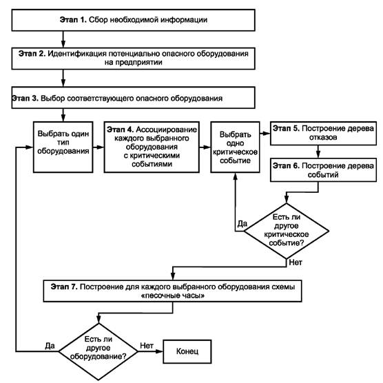 Данная методология предназначена для сбора информации, необходимой для идентификации потенциально опасного оборудования на предприятии и выбора того, которое может быть связано с возникновением значительных инцидентов. Дерево отказов и дерево событий строятся для каждого критического события на основе родовых деревьев, предлагаемых данной методологией. Комбинация дерева отказов и дерева событий составляет схему «галстук-бабочка», которая на этом этапе рассматривается безотносительно барьера безопасности. В комплексе стандартов, представляющих руководство по применению организационных мер безопасности и оценки рисков, мы будем использовать название для этой схемы «песочные часы».