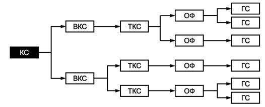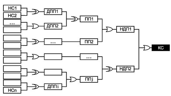 Общий вид структуры дерева отказов представлен на рисунке 2. Дерево отказов ограничено пятью уровнями, связанными логическими И/ИЛИ в соответствии со следующим правилом: комбинация нежелательных событий (НС) приводит к детальным прямым причинам (ДПП), которые в свою очередь приводят к прямым причинам (ПП), вызывающим появление необходимых и достаточных причин (условий) (НДП), приводящих к наступлению критического события (КС).