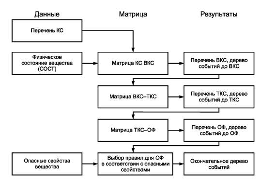 КС - критическое событие (например, прорыв трубопровода) приводит ко вторичному критическому событию (ВКС) (например, образование лужи, струи, облака), потом к третичному критическому событию (ТКС) (возгорание лужи, струи), которые, в свою очередь, приводят к опасному феномену (ОФ) (горение лужи, горение резервуара, токсичное облако, разлет горящих частиц, повышение давления, взрыв пыли). Главное событие (ГС) определяется как оказывающее значимый эффект от опасного феномена для целевого объекта (человека, материального объекта, окружающей среды). К возможным значимым эффектам относятся:
